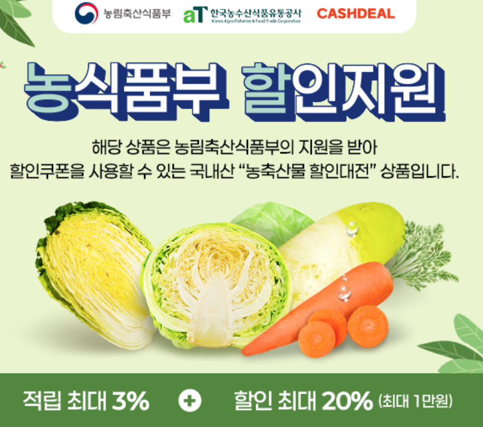 - 주초(월~수): 대형마트 또는 온라인몰에서 국산 농축산물 5~6만 원어치 구매 → 40% 할인 적용