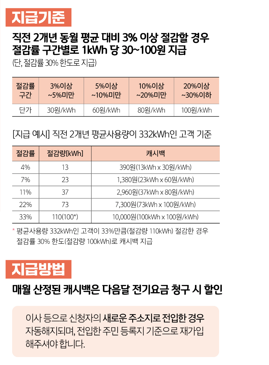 예시) 2023년 7~8월 평균 사용량: 350kWh 2025년 같은 기간: 320kWh → 8.6% 절감 → 캐시백 지급 가능!