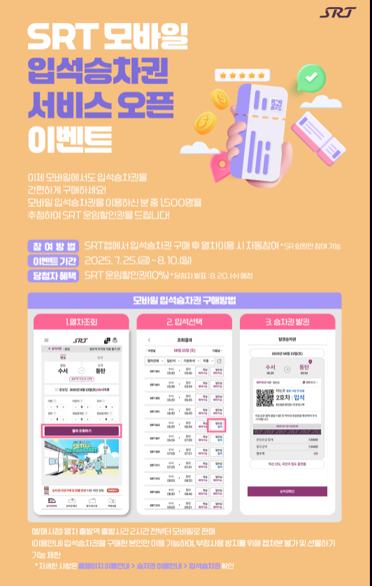 에스알(SR)에서는 모바일 입석승차권 도입을 기념해 2025년 8월 10일까지 특별 이벤트를 진행합니다.