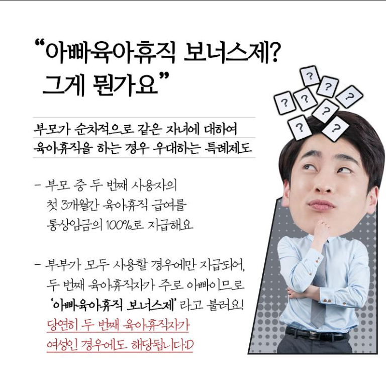 주의할 점은 아빠 보너스제 대상자는 '두 번째 육아휴직자'라는 조건이 있다는 것! 즉, 남편 또는 아내 중 먼저 육아휴직을 한 사람 이후에 쓰는 사람만 적용받을 수 있습니다.