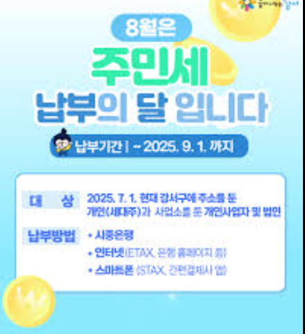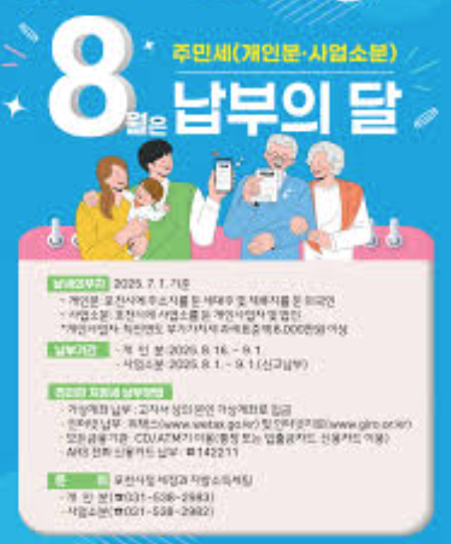 2025년 7월 1일 기준으로 관내에 주소를 둔 가구주는 주민세 개인분을 8월 16일부터 9월 1일까지 납부해야 합니다.
