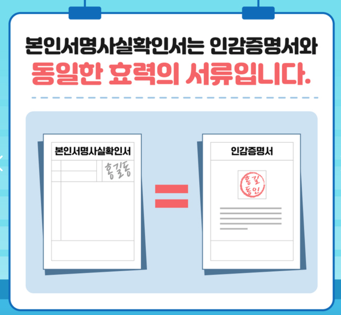 본인서명사실확인서는 인감증명서와 동일한 법적 효력을 갖는 문서로, 도장이 아닌 서명으로 본인을 인증하는 방식입니다.