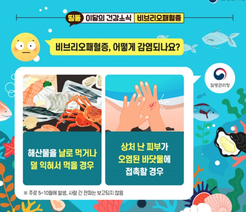 질병관리청이 안내하는 '건강수칙 알리미 앱', 해양수산부의 ‘바다누리 해양정보’ 싸이트 등을 통해 비브리오 감염 예보를 포함한 여름철 감염병 정보도 확인할 수 있습니다.