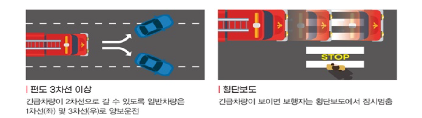 - 편도 2차로 이상 도로 → 좌우 차로로 이동해 중앙에 긴급차량 통로 확보