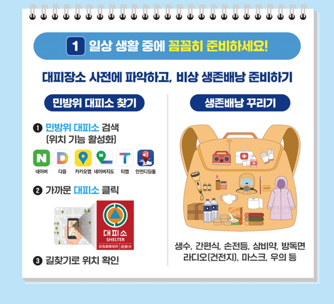 - 사이렌이 울리면 즉시 대피소 이동 가까운 지하철역, 지하상가, 아파트 지하주차장 등으로 신속히 대피합니다.