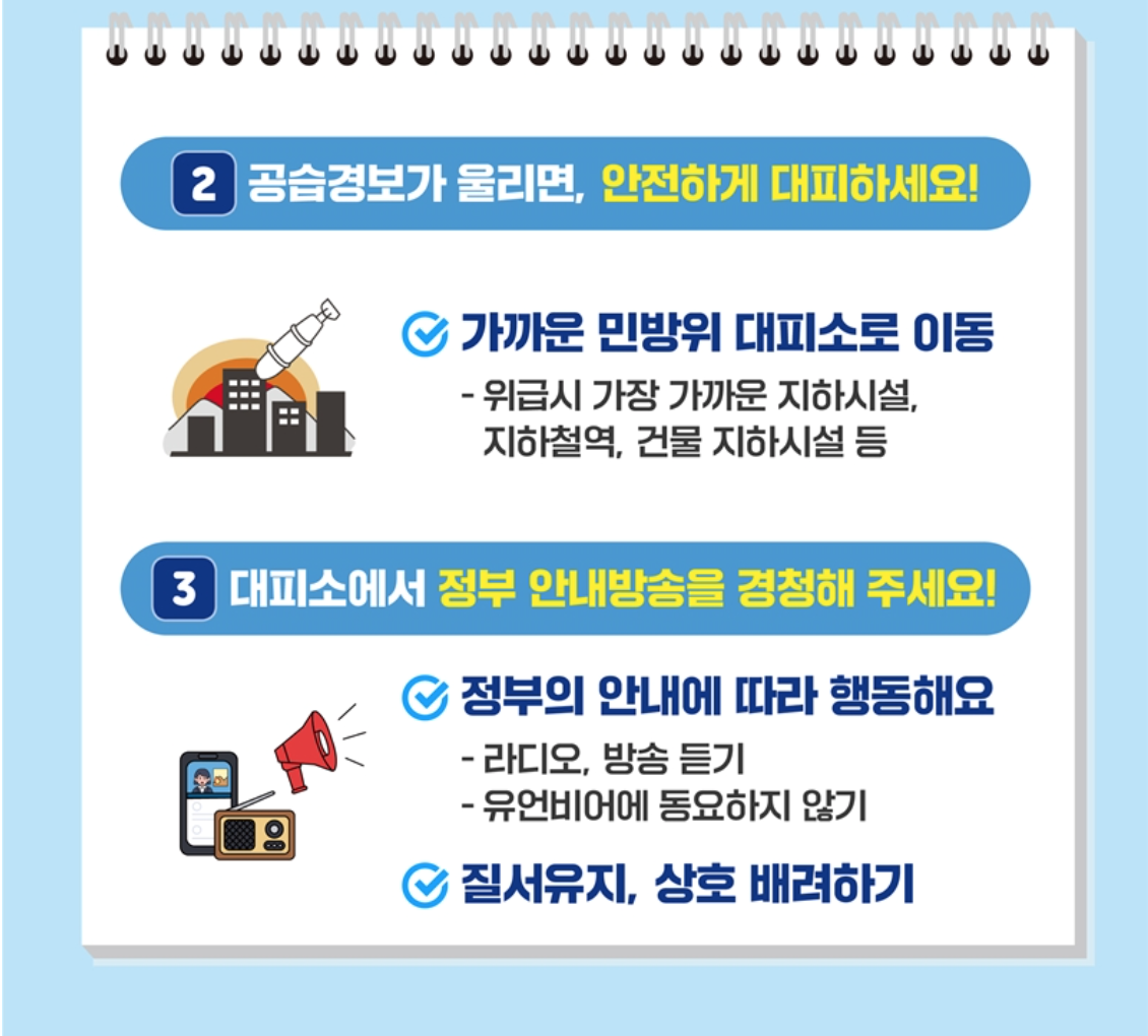 단순히 사이렌이 울리고 대피하는 절차만이 아니라, 공습경보·경계경보·경보해제까지의 단계별 대응을 몸에 익히는 것이 핵심입니다.