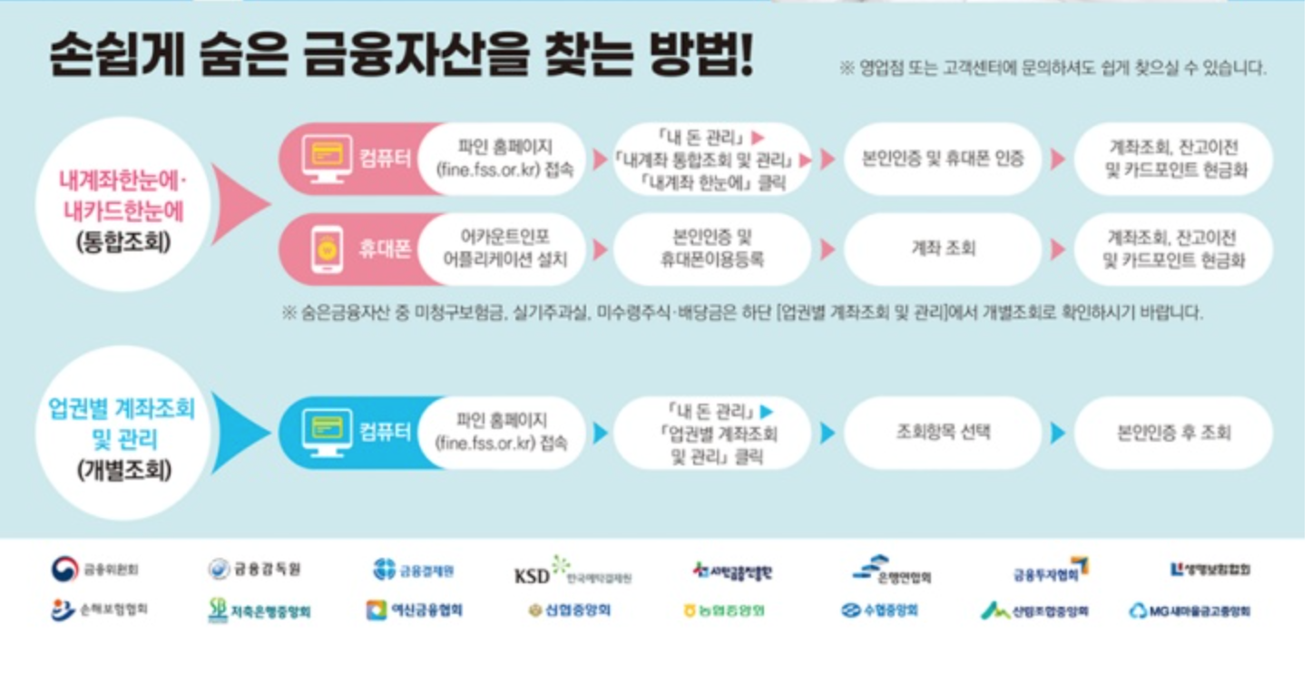 휴면계좌나 미청구 자산을 확인하려면 금융감독원 금융자산 통합조회 서비스를 활용하는 것이 가장 간편합니다.