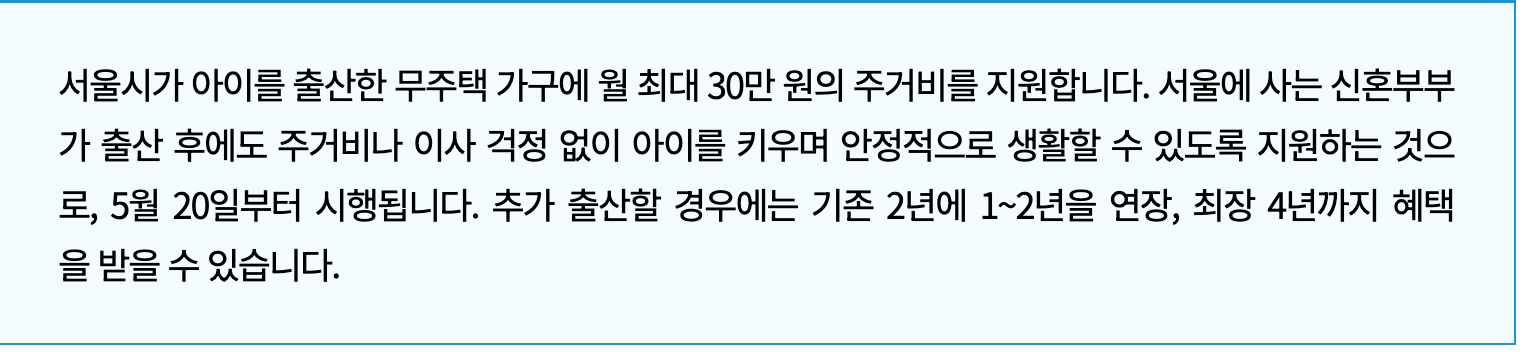 하지만 이제는 서울시가 출산 후에도 서울 거주를 이어갈 수 있도록 주거비를 직접 지원합니다.