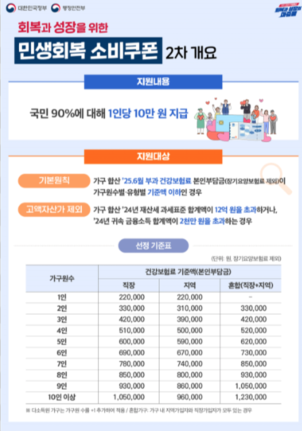 - 지원 규모: 가구원 수에 따라 차등 지급, 소비쿠폰 형태