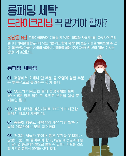 올 겨울, 패딩세탁방법을 잘 숙지하면 집에서도 세탁비용을 절약하면서 오래도록 깨끗하고 포근하게 패딩을 입을 수 있습니다.