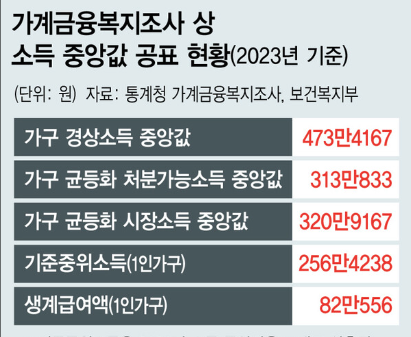 이 수치는 단순한 통계가 아니라 생계급여·의료급여·주거급여·교육급여 등 각종 복지 지원의 기준선으로 활용됩니다.
