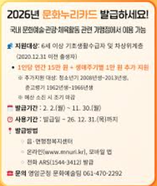 지원 대상 여부는 문화누리카드 홈페이지 또는 주민센터를 통해 확인할 수 있으며, 온라인 신청이 어려운 경우 오프라인 방문 신청도 가능합니다.