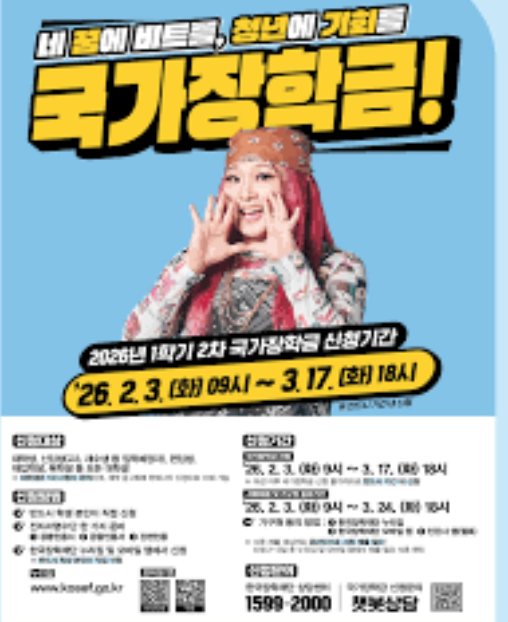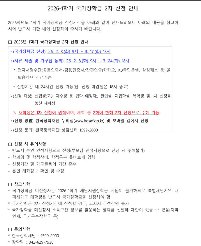 2026년 1학기 국가장학금 2차 신청이 시작되었습니다.