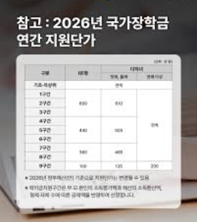 2026년 1학기 기준, 소득 1~8분위 학생까지 지원 가능하며, 지원금액은 다음과 같습니다.