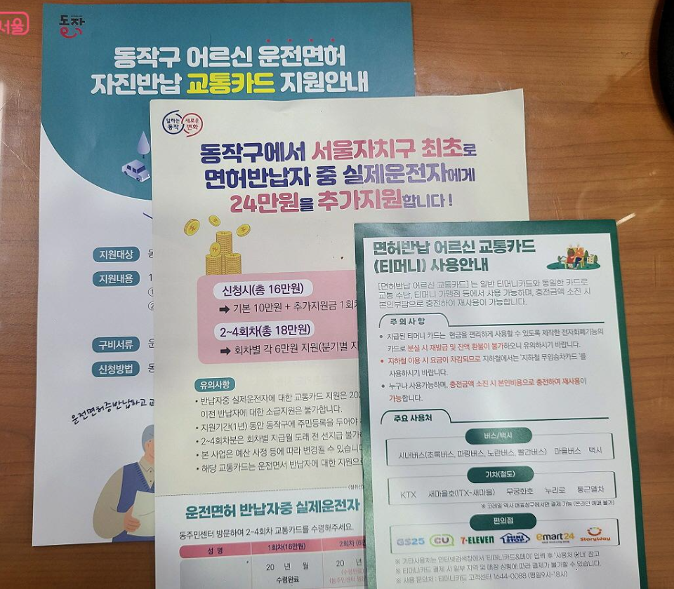 거주지 인근 동주민센터를 직접 방문해 운전면허증을 반납하면, 대상 여부를 확인한 뒤 교통카드가 지급되는 방식입니다.