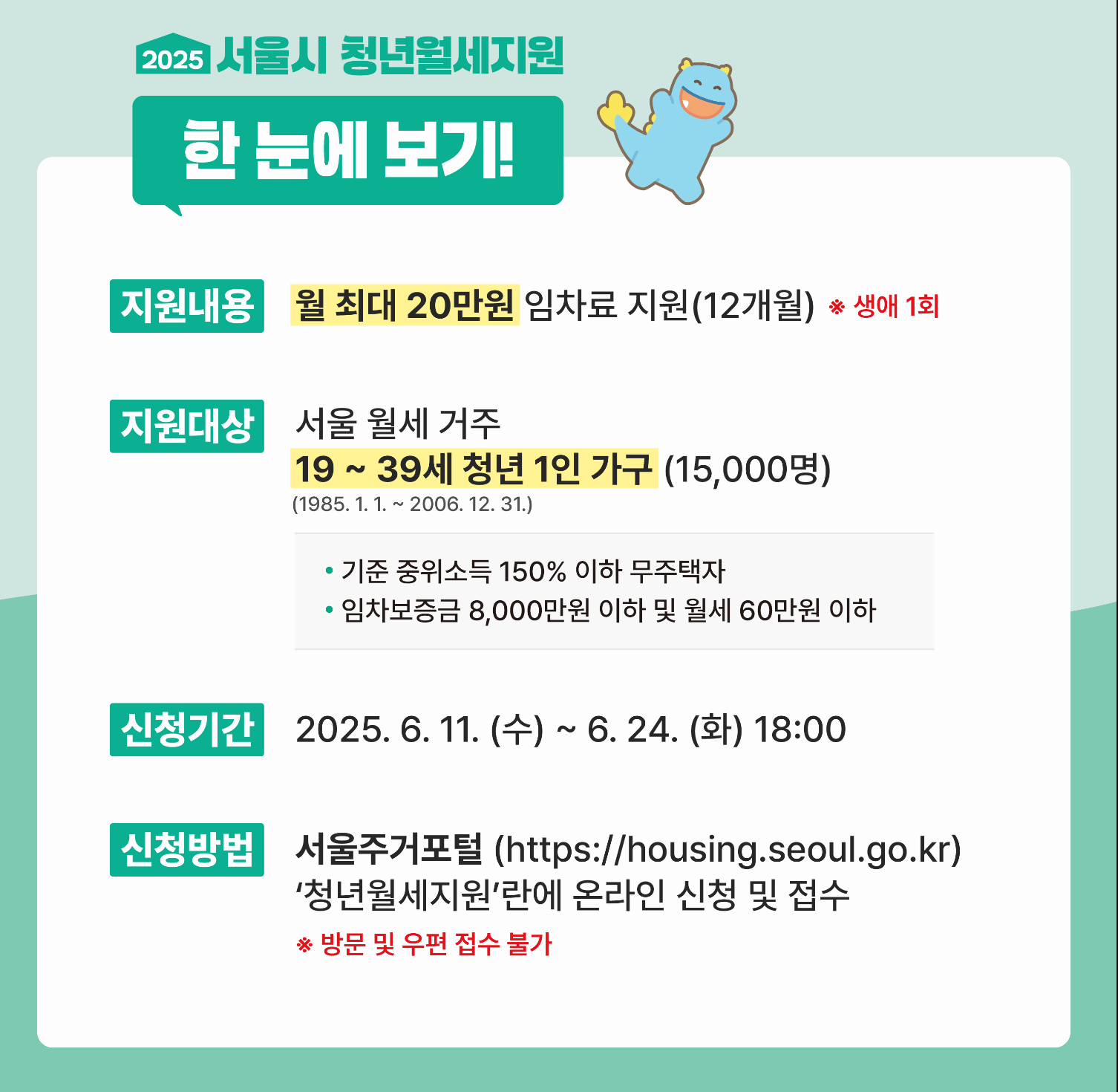 이런 현실을 고려해 서울시가 2025년에도 청년 주거 안정을 위한 월세 지원 정책을 시행합니다.