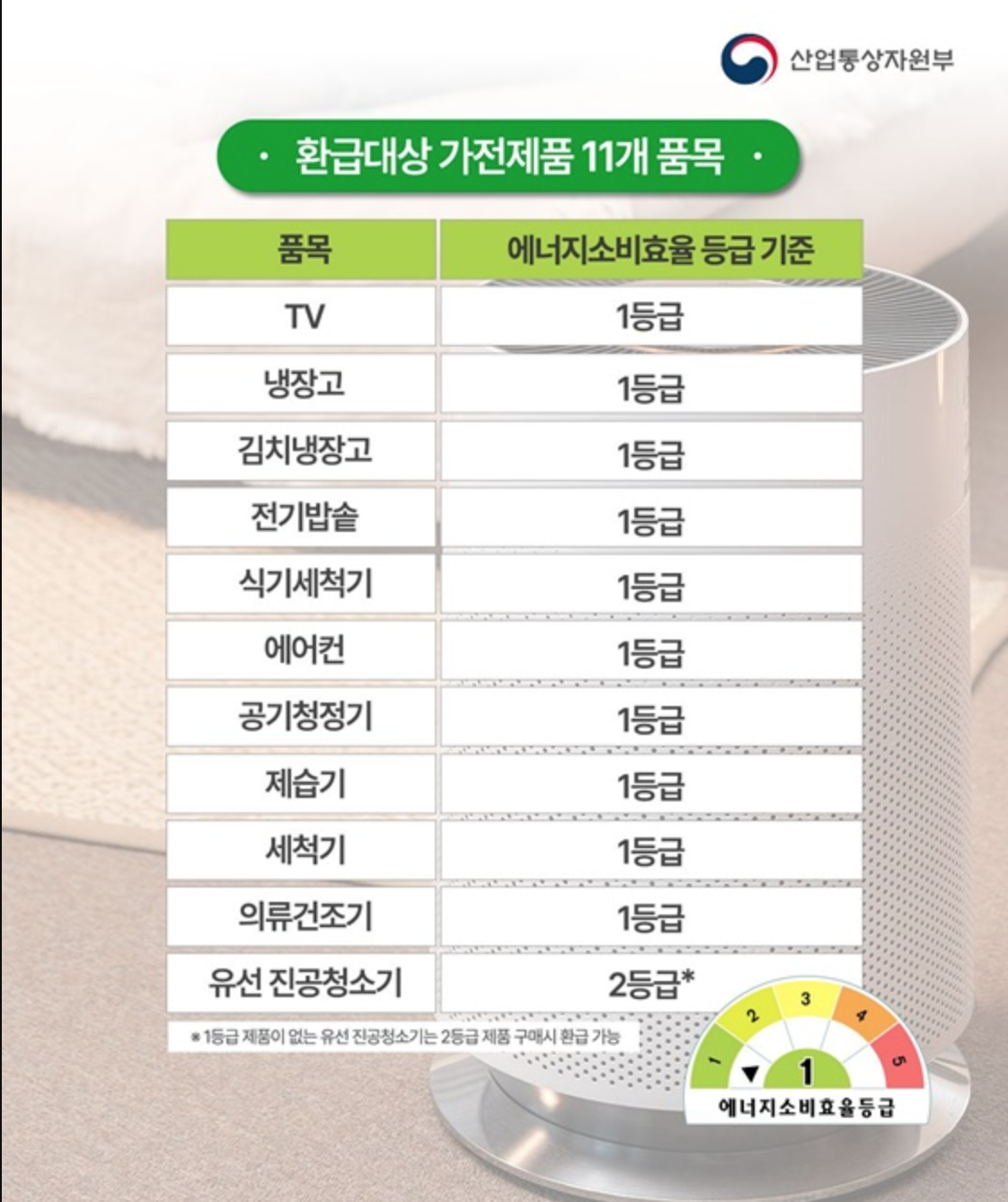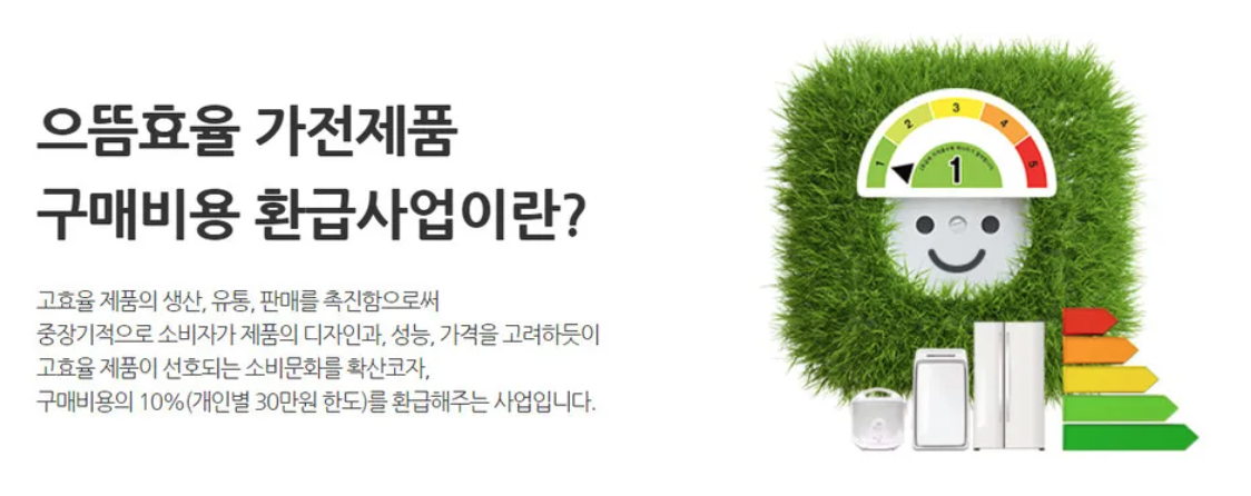 산업통상자원부와 한국에너지공단이 주관하며, 소비자가 1등급 가전제품을 구입할 경우 제품 가격의 10%를 돌려주는 방식으로 운영됩니다.