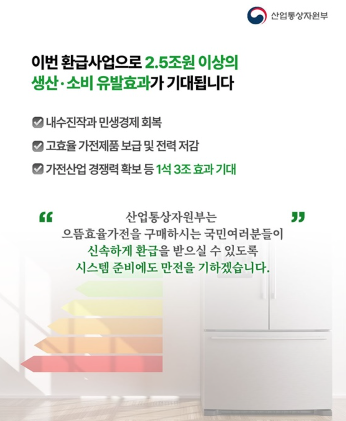 에너지 고효율 가전제품을 구매한 소비자는 10% 환급 혜택을 받을 수 있다. 산업통상자원부는 4일 국회를 통과한 2025년 제2회 추가경정예산을 바탕으로, 총 2,671억원 규모의 '으뜸효율 가전제품
