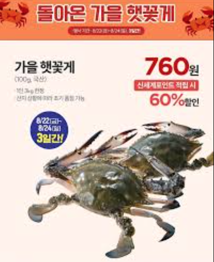 8월 21일 금어기 해제 직후부터 8월 24일까지는 신세계포인트 적립 시 100g당 788원에 햇꽃게를 판매하고 있습니다.