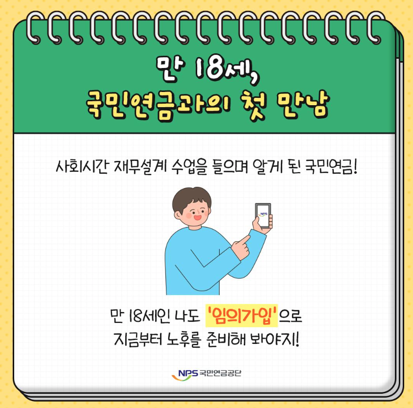 2027년부터 만 18세 청년이 국민연금에 처음 가입하면, 연금 납부액 3개월분을 국가에서 지원하는 제도입니다.