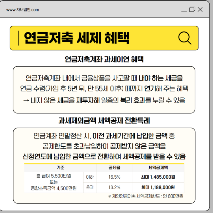 연금저축은 노후 준비뿐만 아니라 절세 혜택을 동시에 누릴 수 있는 상품입니다.