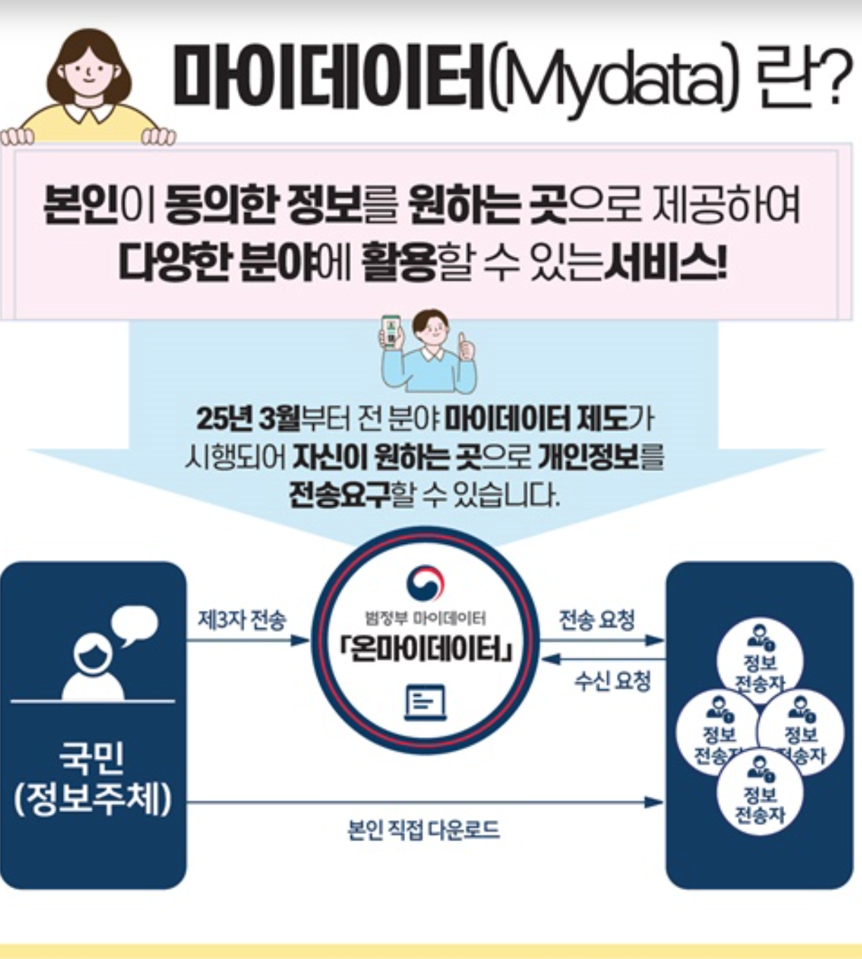 마이데이터(MyData)는 본인이 동의한 개인정보를 원하는 곳에 제공하고, 다양한 분야에서 맞춤형 서비스를 받을 수 있도록 하는 제도입니다.