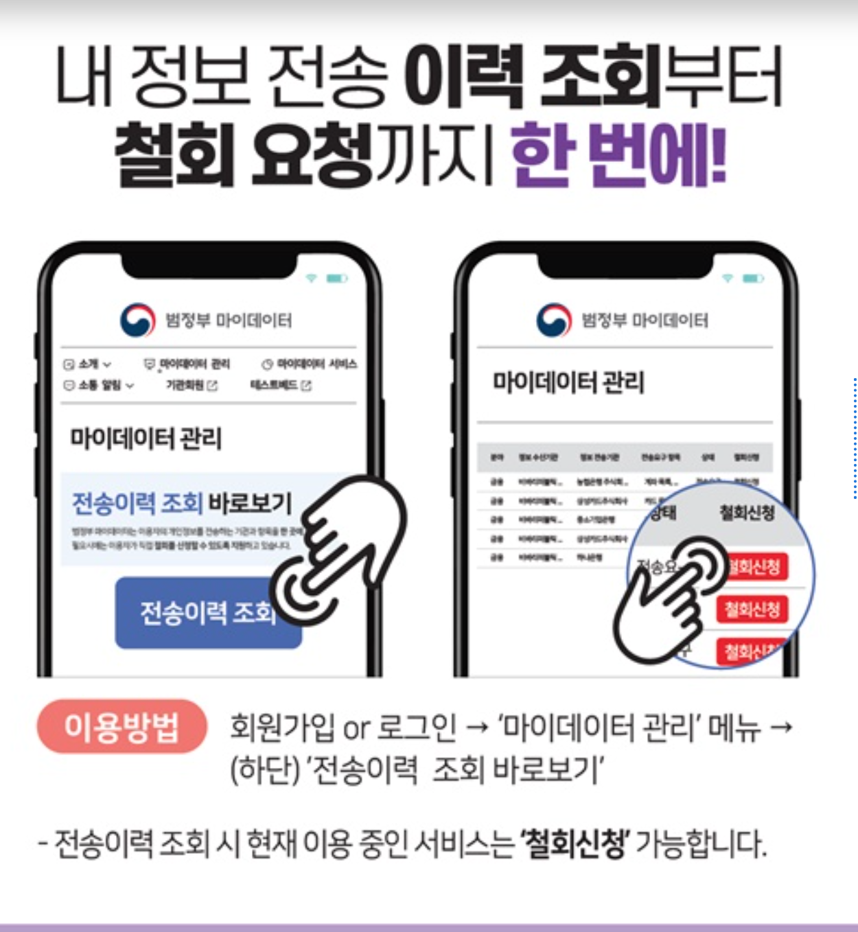 이곳에서 사용자는 본인의 전송 이력을 실시간으로 확인하고, 현재 이용 중인 서비스에 대한 철회 요청도 간편하게 할 수 있습니다.